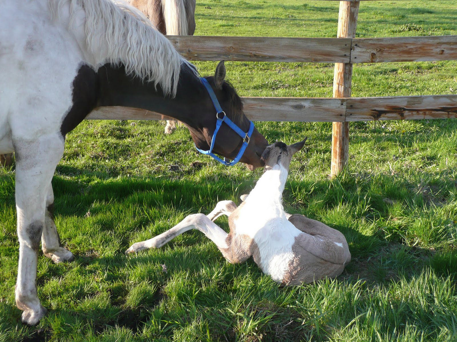 She didn’t want to get up for a good 45 minutes afterwards. She started cramping, but luckily the neighbors, who raise paints, had IV Banamine on hand. Not long after she had a dose, she was on her feet and we were able to take her and the baby up to barn because–despite that pretty sunshine–it was c-c-cold, and the foal was shaking. Isn’t he colorful? What do you think would be a good name?