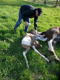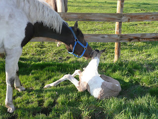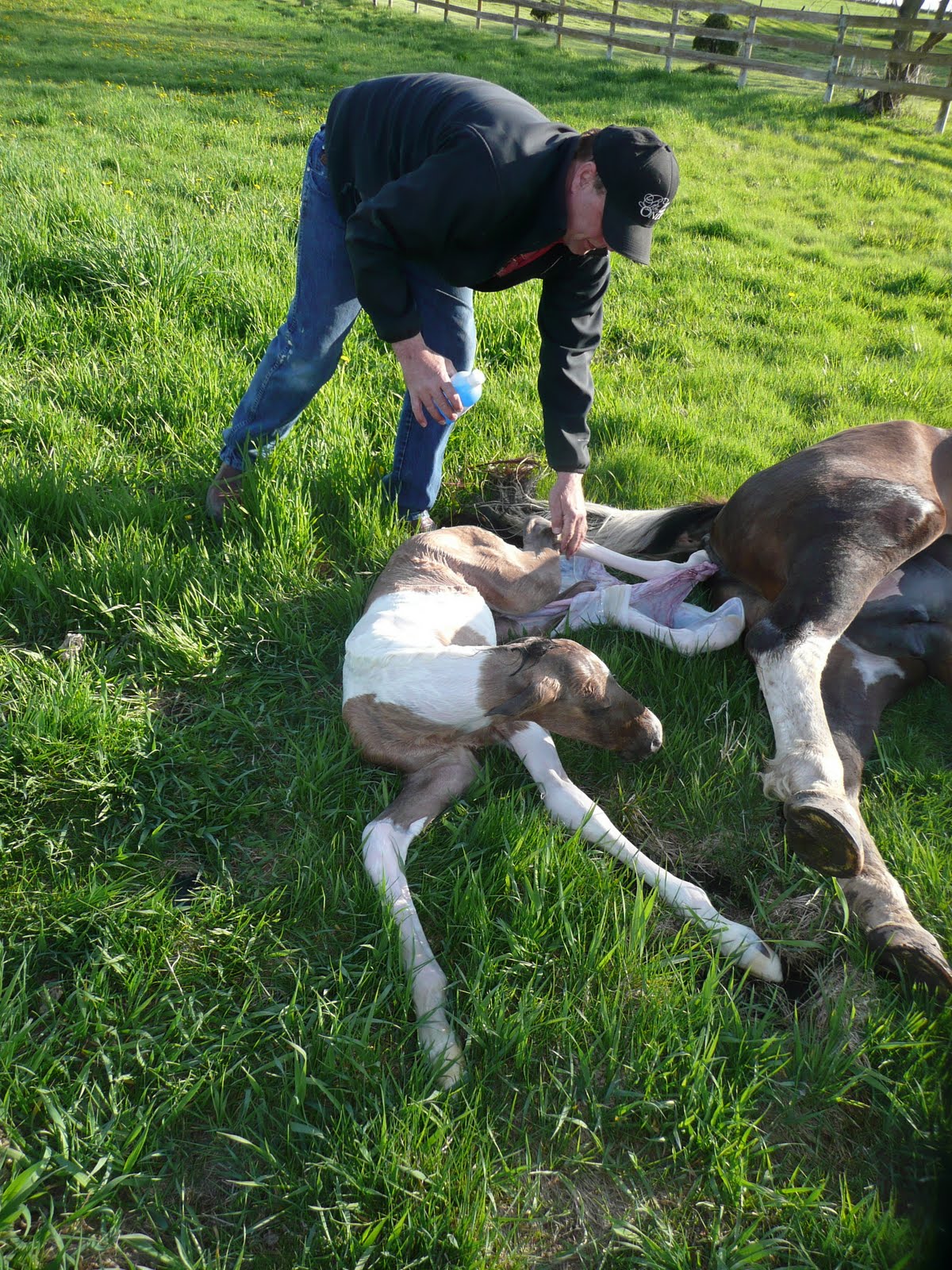 Here is Susie QT Streke’s new foal, born 5/3/11. In this first photo, she is checking him out for the first time while his navel is being treated.